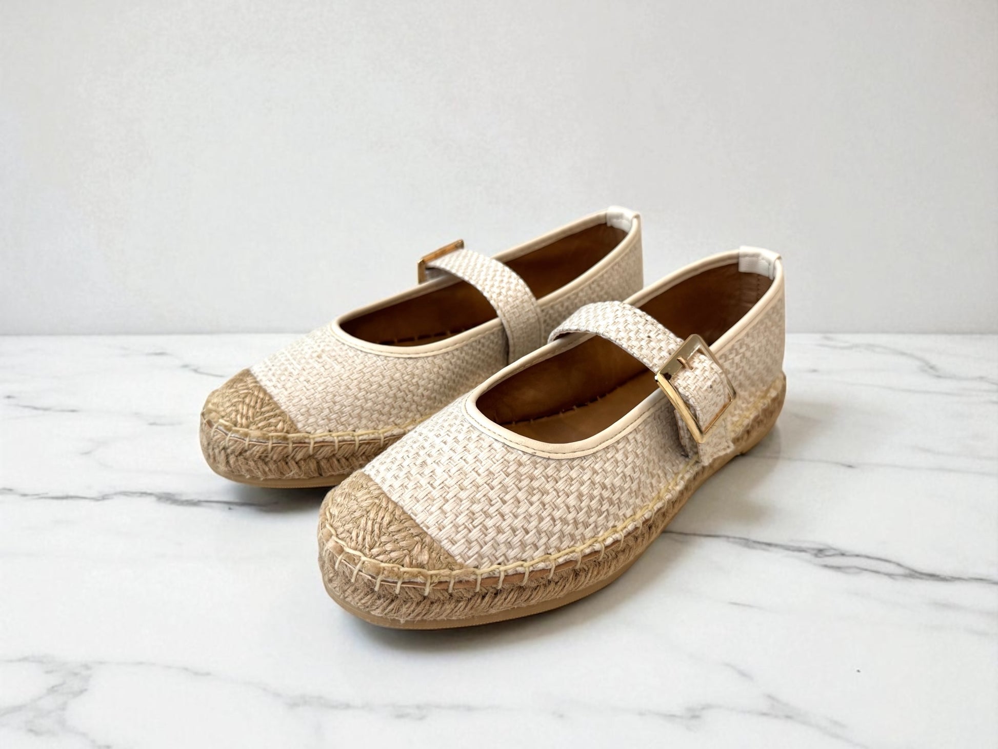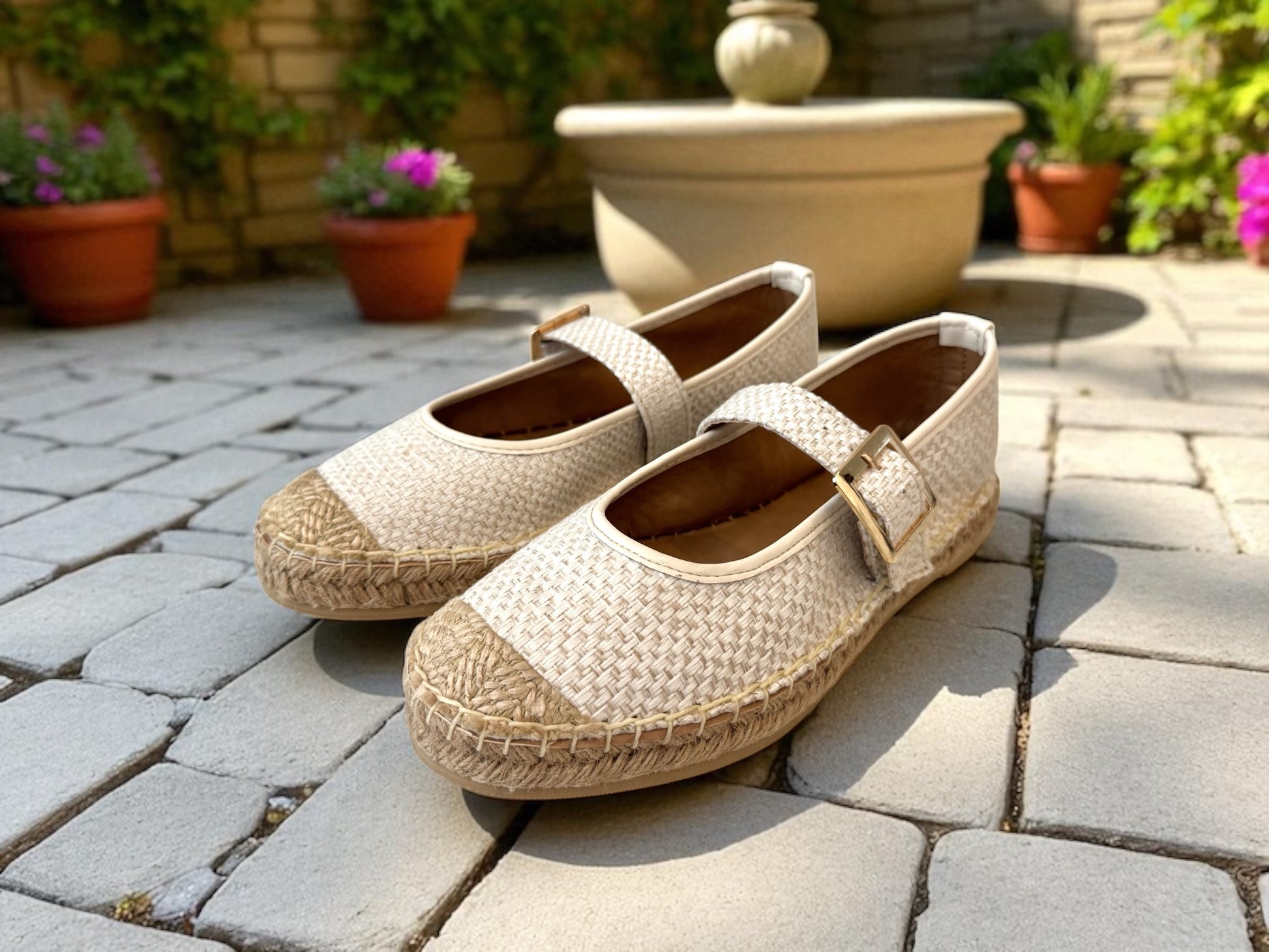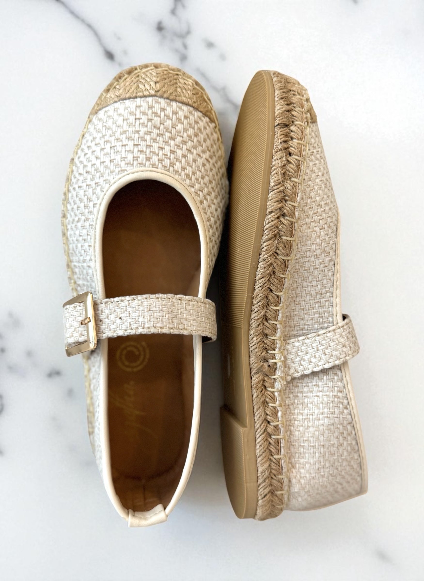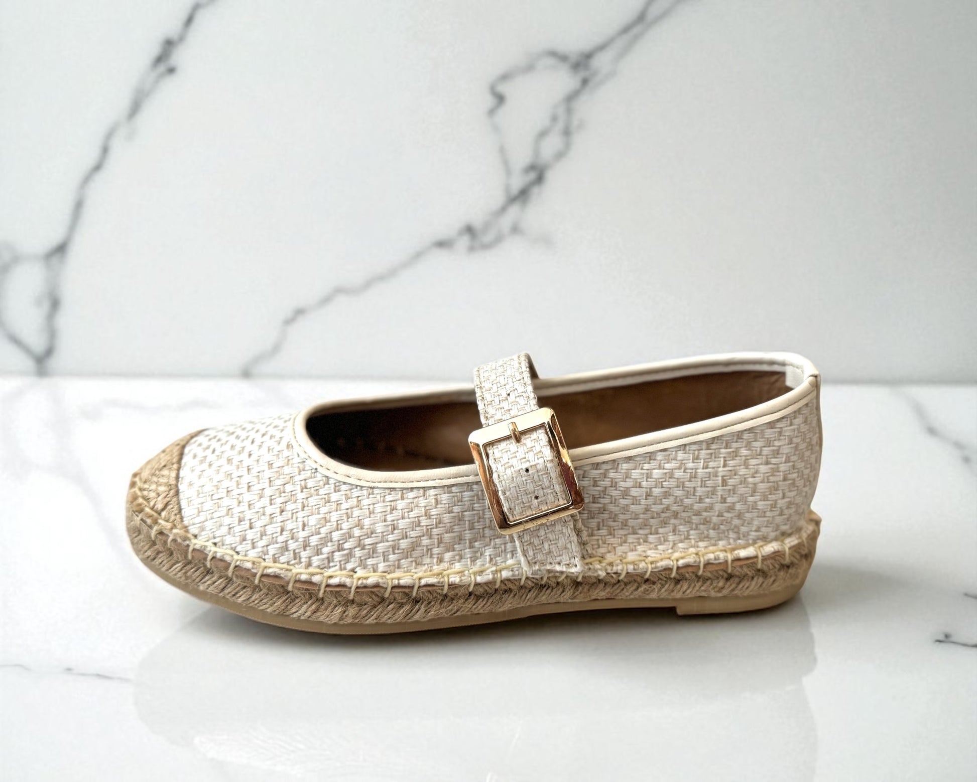 ¡Comodísimas y sin perder el estilo! Alpargata cerrada de tela con yute y hebilla dorada. Talla exacta (no vienen amplios ni reducidos).